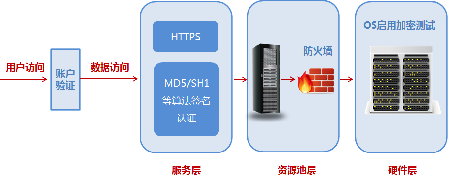 在数据存储层面,OOS将用户数据自动切片,进行分布式保存,并且对每片数据进行签名,即使数据被盗,没有用户的账号信息依然无法对数据进行破解,这样就充分保证了数据在存储层面的安全性。